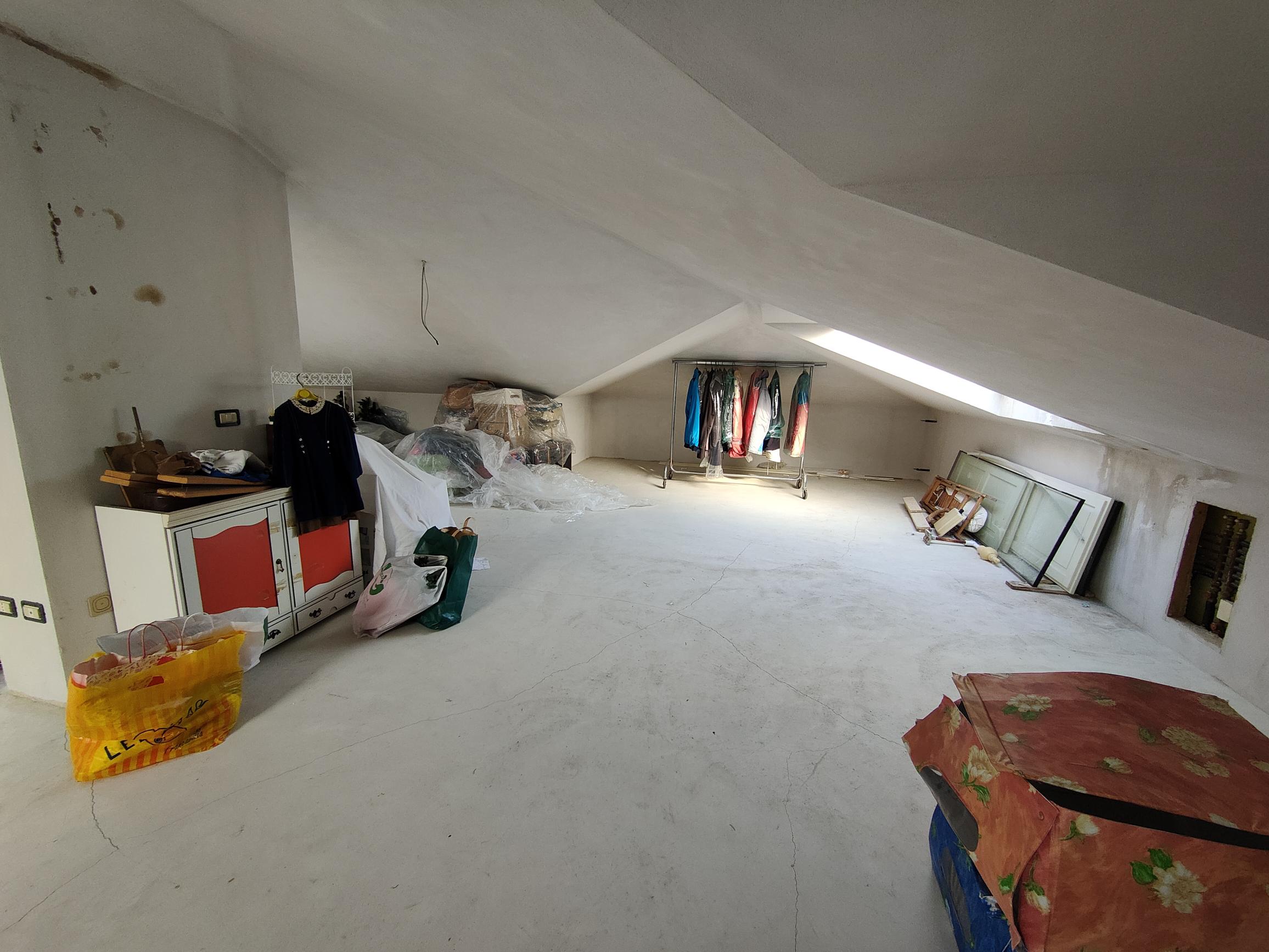 Il secondo piano, invece, è attualmente un unico grande ambiente (mansardato: altezza minima 0,90 mt - massima 2,40 mt).
